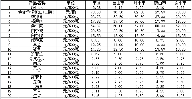 说明:1、表中价格为该地区监测点综合平均价;2、“市区”含春雨直播 、江海区、新会区,价格分别采自蓬江市场、江南市场、城东市场等13家农贸市场;3、其他四个县市价格分别采自新华市场、锦江市场等8家农贸市场。