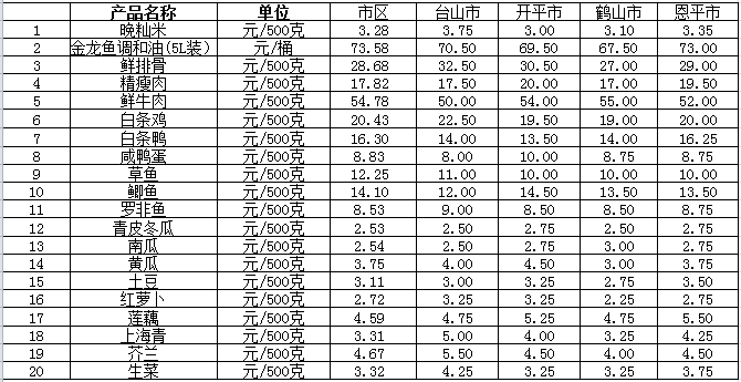 说明:1、表中价格为该地区监测点综合平均价;2、“市区”含春雨直播 、江海区、新会区,价格分别采自蓬江市场、江南市场、城东市场等13家农贸市场;3、其他四个县市价格分别采自新华市场、锦江市场等8家农贸市场。