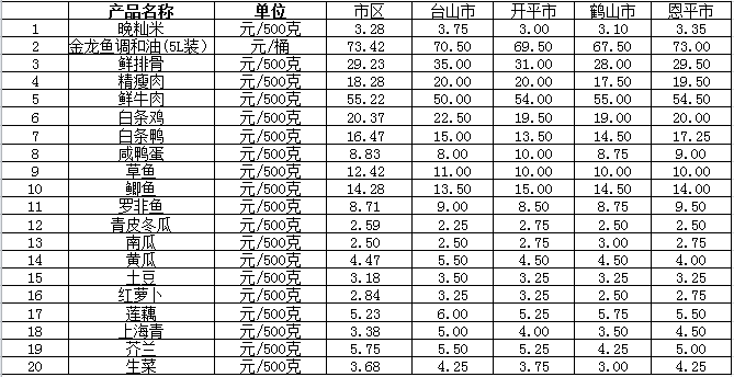 说明:1、表中价格为该地区监测点综合平均价;2、“市区”含春雨直播 、江海区、新会区,价格分别采自蓬江市场、江南市场、城东市场等13家农贸市场;3、其他四个县市价格分别采自新华市场、锦江市场等8家农贸市场。