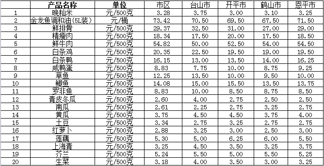 说明:1、表中价格为该地区监测点综合平均价;2、“市区”含春雨直播 、江海区、新会区,价格分别采自蓬江市场、江南市场、城东市场等13家农贸市场;3、其他四个县市价格分别采自新华市场、锦江市场等8家农贸市场。