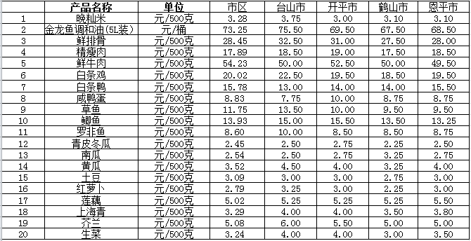 说明:1、表中价格为该地区监测点综合平均价;2、“市区”含春雨直播 、江海区、新会区,价格分别采自蓬江市场、江南市场、城东市场等13家农贸市场;3、其他四个县市价格分别采自新华市场、锦江市场等8家农贸市场。