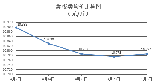 禽蛋类商品价格微幅回升。所监测的6种禽蛋类商品价格波动情况为3涨2跌1平,综合零售均价为每斤10.787元,环比上涨0.11%。其中:白条鸡、白条鸭零售均价分别为每斤19.94元、14.94元,环比分别下降0.10%、上涨0.88%;白壳鸡蛋、鸭蛋零售均价分别为每斤6.32元、7.51元,环比分别持平、上涨0.40%。