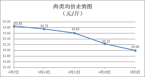 肉类商品价格总体略降。所监测的8种肉类商品价格波动情况为1涨5跌2平,综合零售均价为每斤33.00元,环比下降0.69%。其中:排骨、精瘦肉、有皮上肉、牛肉、带骨羊肉零售均价分别为每斤29.12元、18.14元、14.29元、50.34元、43.33元,环比分别下降0.14%、持平、持平、下降1.10%、下降0.32%。