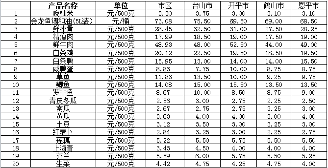 说明:1、表中价格为该地区监测点综合平均价;2、“市区”含春雨直播 、江海区、新会区,价格分别采自蓬江市场、江南市场、城东市场等13家农贸市场;3、其他四个县市价格分别采自新华市场、锦江市场等8家农贸市场。