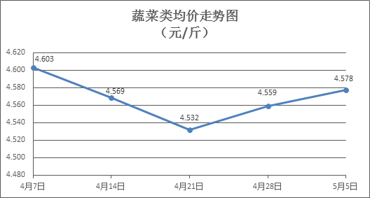 蔬菜类商品价格以涨为主。所监测的32 种蔬菜商品价格波动情况为19涨11跌2平,综合零售均价为每斤4.578元,环比上涨0.41%。其中:涨幅居前的品种包括西红柿、菠菜、土豆,零售均价分别为每斤4.20元、5.25元、3.12元,环比分别上涨6.06%、3.35%、2.63%;跌幅靠前的品种包括蒜苔、苦瓜、丝瓜,零售均价分别为每斤8.30元、5.00元、4.67元,环比分别下降3.38%、2.34%、2.10%。