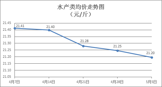 水产类商品价格总体微降。所监测的10种水产商品价格波动情况为2涨4跌4平,综合均价为每斤21.20元,环比下降0.24%。其中:草鱼、鲫鱼、罗非鱼、基围虾零售均价分别为每斤11.18元、14.25元、8.74元、32.73元,环比分别上涨0.27%、持平、下降0.57%、下降0.52%。