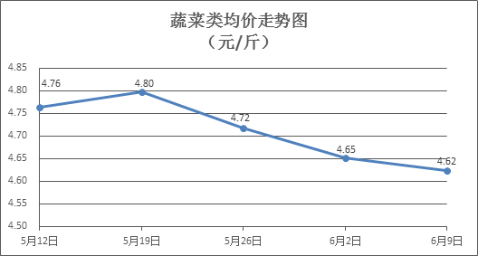蔬菜类商品价格以降为主。所监测的32 种蔬菜商品价格波动情况为8涨21跌3平,综合零售均价为每斤4.62元,环比下降0.56%。其中:涨幅居前的品种包括莴笋、丝瓜、莲藕,零售均价分别为每斤3.89元、4.48元、6.14元,环比分别上涨5.71%、5.66%、3.54%;跌幅靠前的品种包括青豆角、苦瓜、生菜,零售均价分别为每斤5.47元、4.52元、4.12元,环比分别下降6.50%、5.04%、4.19%。