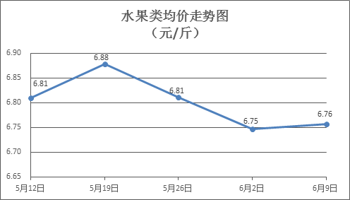 水果类商品价格升降互现。所监测的6种水果商品价格波动情况为3涨3跌,综合零售均价为每斤6.76元,环比上涨0.15%。其中橙子、香蕉、葡萄零售均价分别为每斤5.69元、2.95元、14.90元,环比分别上涨0.35%、上涨3.15%、下降0.20%。
