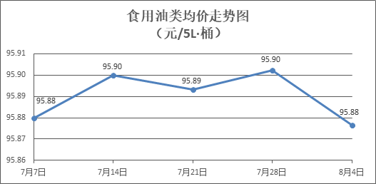 食用油类商品价格微幅波动。所监测的9种食用油(5L装)商品价格波动情况为2涨3跌4平,综合零售均价为每桶95.88元,环比下降0.03%。其中:胡姬花花生油、菜籽油零售均价分别为每桶145.08元、73.15元,环比分别下降0.29%、上涨0.11%。