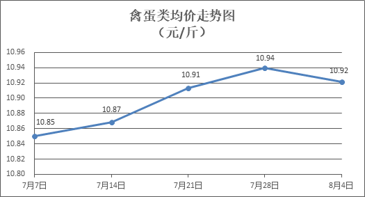 禽蛋类商品价格窄幅盘整。所监测的6种禽蛋类商品价格波动情况为3涨2跌1平,综合零售均价为每斤10.92元,环比下降0.17%。其中:白条鸡、白条鸭零售均价分别为每斤19.95元、15.13元,环比分别下降0.15%、上涨0.07%;白壳鸡蛋、咸鸭蛋零售均价分别为每斤6.53元、9.00元,环比分别上涨0.62%、持平。