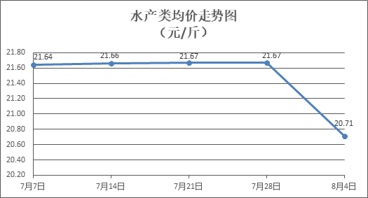 水产类商品价格小幅下降。所监测的10种水产商品价格波动情况为1涨8跌1平,综合均价为每斤20.71元,环比下降4.46%。其中:草鱼、鲢鱼、鲈鱼、罗非鱼、海虾零售均价分别为每斤11.24元、9.25元、21.64元、8.93元、57.75元,环比分别下降0.44%、持平、下降1.50%、上涨0.34%、下降12.50%。