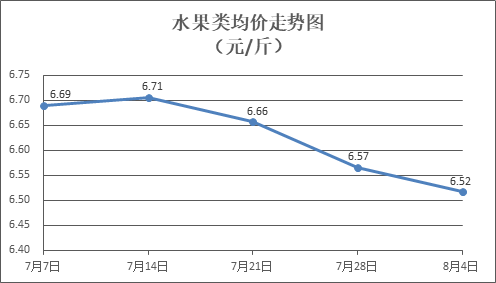 水果类商品价格走势偏弱。所监测的6种水果商品价格波动情况为2涨3跌1平,综合零售均价为每斤6.52元,环比下降0.71%。其中橙子、葡萄、梨零售均价分别为每斤5.65元、13.93元、5.80元,环比分别下降0.18%、下降1.97%、上涨0.17%。