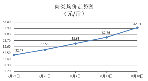 猪肉商品价格继续走强。所监测的8种肉类商品价格波动情况为5涨2跌1平,综合零售均价为每斤32.91元,环比上涨0.48%。其中:排骨、精瘦肉、牛肉、带骨羊肉零售均价分别为每斤32.60元、20.19元、45.41元、43.43元,环比分别上涨1.18%、上涨1.92%、下降0.02%、上涨0.18%。