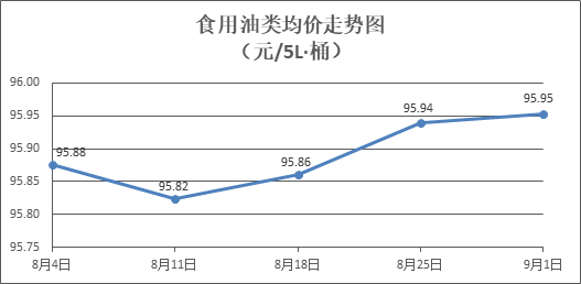 食用油类商品价格基本平稳。所监测的9种食用油(5L装)商品价格波动情况为2涨7平,综合零售均价为每桶95.95元,环比上涨0.01%。其中:菜籽油、玉米油零售均价分别为每桶74.42元、77.67元,环比分别上涨0.07%、上涨0.09%。