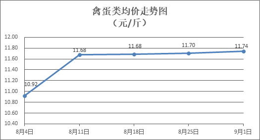 禽蛋类商品价格稳中略涨。所监测的5种禽蛋类商品价格波动情况为4涨1平,综合零售均价为每斤11.74元,环比上涨0.32%。其中:白条鸡、白条鸭零售均价分别为每斤20.09元、15.32元,环比分别上涨0.20%、上涨0.52%;白壳鸡蛋、鸭蛋零售均价分别为每斤6.52元、7.73元,环比分别持平、上涨0.39%。