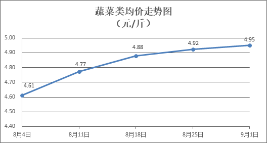 蔬菜类商品价格以涨为主。所监测的32 种蔬菜商品价格波动情况为21涨9跌2平,综合零售均价为每斤4.95元,环比上涨0.58%。其中:涨幅居前的品种包括白萝卜、花菜、奶白菜,零售均价分别为每斤2.64元、5.62元、5.31元,环比分别上涨7.32%、2.55%、2.51%;跌幅靠前的品种包括莲藕、莴笋、黄瓜,零售均价分别为每斤5.67元、5.20元、4.40元,环比分别下降3.57%、1.89%、1.35%。