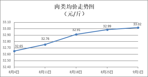 肉类商品价格微幅盘升。所监测的8种肉类商品价格波动情况为4涨3跌1平,综合零售均价为每斤33.02元,环比上涨0.10%。其中:排骨、精瘦肉、牛肉、带骨羊肉零售均价分别为每斤33.02元、20.35元、45.46元、43.37元,环比分别上涨0.70%、上涨0.05%、持平、下降0.02%。