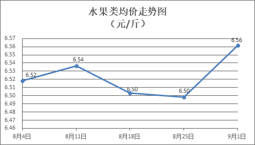 水果类商品价格小幅上涨。所监测的6种水果商品价格波动情况为4涨1跌1平,综合零售均价为每斤6.56元,环比上涨0.97%。其中橙子、葡萄、西瓜零售均价分别为每斤5.95元、13.58元、3.25元,环比分别上涨2.06%、上涨1.57%、上涨0.93%。