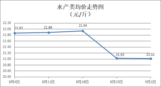水产类商品窄幅盘整。所监测的9种水产商品价格波动情况为6涨2跌1平,综合均价为每斤21.02元,环比下降0.05%。其中:草鱼、鲢鱼、罗非鱼、海虾零售均价分别为每斤11.21元、9.92元、8.91元、49.25元,环比分别上涨0.27%、上涨1.43%、下降0.11%、下降1.50%。