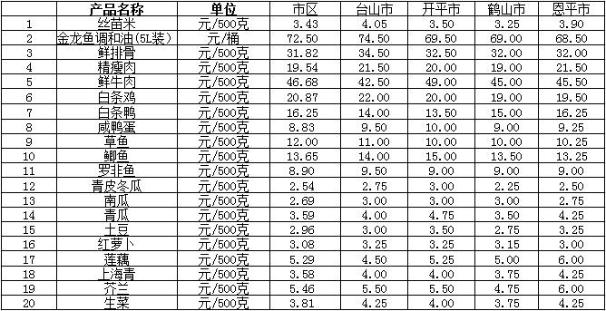 说明:1、表中价格为该地区监测点综合平均价;2、“市区”含春雨直播 、江海区、新会区,价格分别采自蓬江市场、江南市场、城东市场等13家农贸市场;3、其他四个县市价格分别采自新华市场、锦江市场等8家农贸市场。