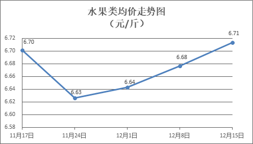 水果类商品价格小幅波动。所监测的6种水果商品价格波动情况为2涨3跌1平,综合零售均价为每斤6.71元,环比上涨0.55%。其中橙子、苹果、葡萄零售均价分别为每斤5.99元、7.46元、14.06元,环比分别下降0.83%、上涨0.13%、上涨2.03%。