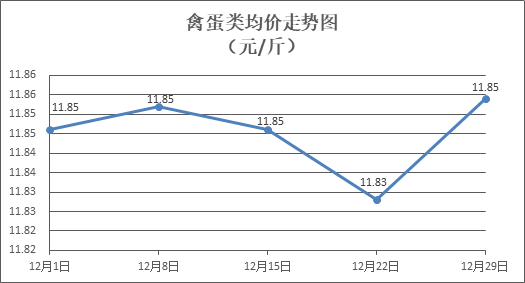禽蛋类商品价格略有回升。所监测的5种禽蛋类商品价格波动情况为3涨2平,综合零售均价为每斤11.85元,环比上涨0.22%。其中:白条鸡、白条鸭零售均价分别为每斤20.64元、15.25元,环比分别上涨0.44%、上涨0.20%;鸡蛋、咸鸭蛋零售均价分别为每斤6.55元、9.15元,环比分别持平、上涨0.11%。