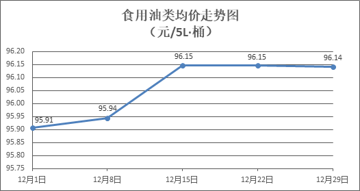 食用油类商品价格稳中微降。所监测的9种食用油(5L装)商品价格波动情况为1涨3跌5平,综合零售均价为每桶96.14元,环比下降0.01%。其中:金龙鱼花生油、大豆油零售均价为每桶103.14元、62.49元,环比分别下降0.06%、下降0.06%。