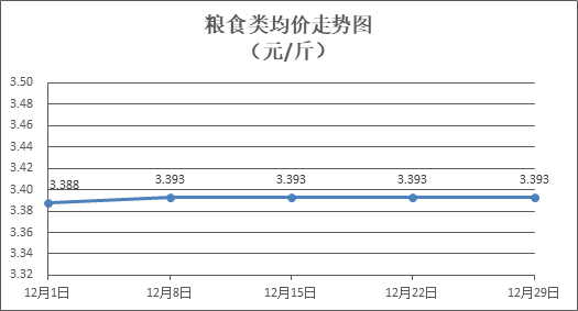 粮食类商品价格保持稳定。所监测的4种粮食类商品价格均持平,零售均价为每斤3.393元。其中:油粘米、富强粉零售均价分别为每斤3.52元、3.36元,环比均持平。