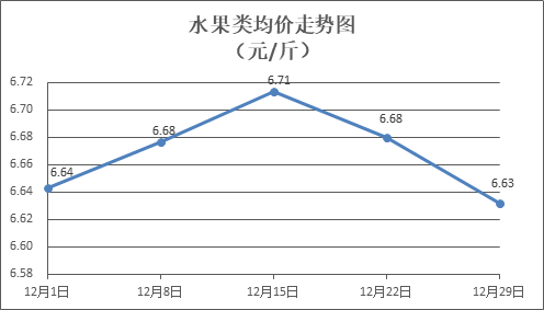 水果类商品价格总体略降。所监测的6种水果商品价格波动情况为1涨4跌1平,综合零售均价为每斤6.63元,环比下降0.72%。其中橙子、苹果、葡萄零售均价分别为每斤5.84元、7.36元、13.89元,环比分别下降2.01%、下降0.94%、下降0.50%。