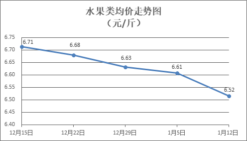 水果类商品价格继续走弱。所监测的6种水果商品价格波动情况为2涨4跌,综合零售均价为每斤6.52元,环比下降1.39%。其中橙子、苹果、葡萄零售均价分别为每斤5.82元、7.24元、13.77元,环比分别上涨0.52%、下降0.41%、下降1.15%。