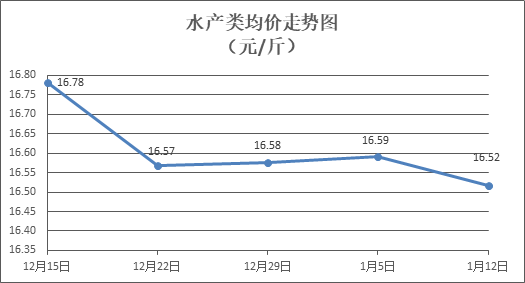 水产类商品价格窄幅盘整。所监测的9种水产商品价格波动情况为3涨5跌1平,综合均价为每斤16.52元,环比下降0.44%。其中:草鱼、鲫鱼、罗非鱼、鳙鱼、基围虾零售均价分别为每斤10.86元、14.15元、9.04元、10.50元、29.43元,环比分别下降1.45%、上涨0.86%、下降0.55%、下降1.59%、下降1.14%。