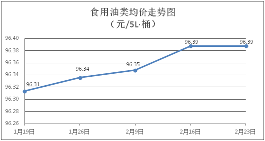 食用油类商品价格基本平稳。所监测的9种食用油(5L装)商品价格均持平,综合零售均价为每桶96.39元。其中:鲁花花生油、金龙鱼调和油零售均价为每桶156.04元、72.00元,环比均持平。