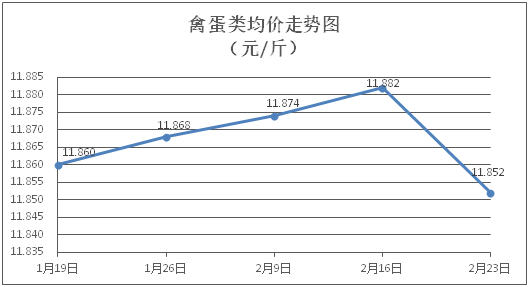 禽蛋类商品价格微幅下降。所监测的5种禽蛋类商品价格波动情况为3跌2平,综合零售均价为每斤11.852元,环比下降0.25%。其中:白条鸡、白条鸭零售均价分别为每斤20.58元、15.28元,环比分别下降0.48%、下降0.13%;鸡蛋、鸭蛋零售均价分别为每斤6.61元、7.65元,环比分别下降0.45%、持平。