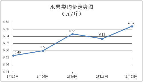 水果类商品价格总体略涨。所监测的6种水果商品价格波动情况为4涨2跌,综合零售均价为每斤6.57元,环比上涨0.54%。其中橙子、香蕉、葡萄零售均价分别为每斤5.96元、3.15元、13.68元,环比分别上涨1.02%、下降0.94%、上涨0.74%。