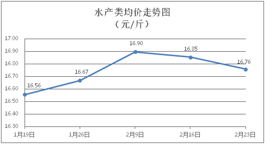 水产类商品价格略有下降。所监测的9种水产商品价格波动情况为6跌3平,综合均价为每斤16.76元,环比下降0.57%。其中:草鱼、鲫鱼、鳙鱼、罗非鱼、基围虾零售均价分别为每斤11.09元、14.32元、10.79元、9.19元、30.09元,环比分别下降0.98%、下降0.97%、下降0.37%、下降1.08%、下降1.28%。