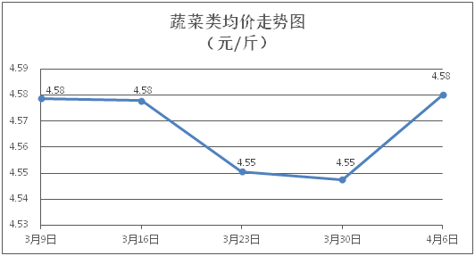 蔬菜类商品价格以涨为主。所监测的32 种蔬菜商品价格波动情况为21涨8跌3平,综合零售均价为每斤4.58元,环比上涨0.71%。其中:涨幅居前的品种包括西洋菜、白苋菜、西红柿,零售均价分别为每斤3.52元、4.90元、4.21元,环比分别上涨3.23%、3.16%、2.68%;跌幅靠前的品种包括水空心菜、西芹、苦瓜,零售均价分别为每斤5.13元、4.66元、6.16元,环比分别下降1.54%、1.27%、1.12%。