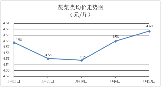 据本市21家农贸市场监测数据显示,上周(4月7日至4月13日)市场上各类“菜篮子”商品供应充足,所监测的7大类“菜篮子”商品价格环比总体表现为4涨3跌。其中:粮油类、禽蛋类商品价格稳中略降,肉类、蔬果类、水产类商品价格总体略涨。