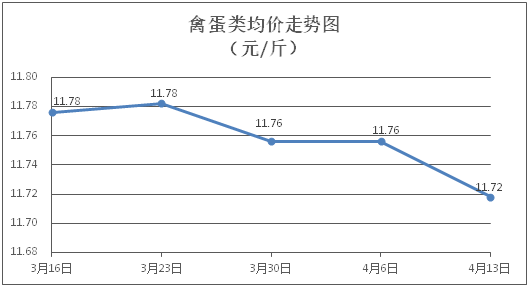 禽蛋类商品价格略有下降。所监测的5种禽蛋类商品价格波动情况为2涨3跌,综合零售均价为每斤11.72元,环比下降0.32%。其中:白条鸡、白条鸭零售均价分别为每斤20.47元、15.24元,环比分别下降0.29%、上涨0.46%;鸡蛋、鸭蛋零售均价分别为每斤6.28元、7.40元,环比分别下降0.63%、下降2.37%。