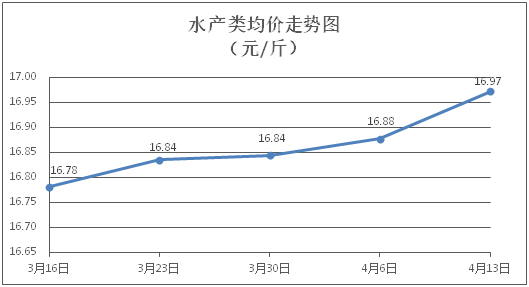 水产类商品价格继续微涨。所监测的9种水产商品价格波动情况为6涨2跌1平,综合均价为每斤16.97元,环比上涨0.57%。其中:黄花鱼、草鱼、鲫鱼、罗非鱼、基围虾零售均价分别为每斤22.90元、11.06元、14.24元、9.10元、30.29元,环比分别上涨0.88%、上涨0.55%、下降0.28%、下降0.11%、上涨0.53%。