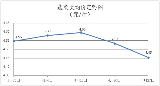 蔬菜类商品价格以降为主。所监测的32 种蔬菜商品价格波动情况为5涨22跌5平,综合零售均价为每斤4.45元,环比下降1.78%。其中:涨幅居前的品种包括西洋菜、菠菜、土豆,零售均价分别为每斤3.69元、5.10元、3.03元,环比分别上涨3.07%、2.82%、1.34%;跌幅靠前的品种包括白苋菜、丝瓜、苦瓜,零售均价分别为每斤4.28元、4.51元、5.71元,环比分别下降7.96%、7.77%、6.85%。