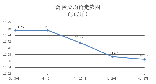 禽蛋类商品价格微幅下降。所监测的5种禽蛋类商品价格波动情况为3跌2平,综合零售均价为每斤11.67元,环比下降0.07%。其中:白条鸡、白条鸭零售均价分别为每斤20.56元、15.21元,环比分别下降0.05%、下降0.07%;鸡蛋、鸭蛋零售均价分别为每斤6.21元、7.14元,环比分别持平、下降0.28%。