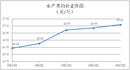 水产类商品价格总体略涨。所监测的9种水产商品价格波动情况为6涨2跌1平,综合均价为每斤17.01元,环比上涨0.14%。其中:草鱼、鲫鱼、罗非鱼、基围虾零售均价分别为每斤11.09元、14.20元、9.06元、30.41元,环比分别上涨0.09%、上涨0.07%、持平、下降0.36%。