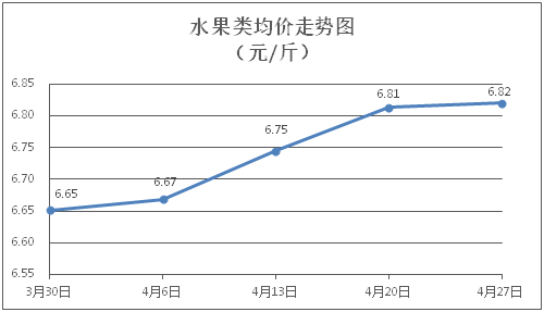 水果类商品价格微幅波动。所监测的6种水果商品价格波动情况为3涨1跌2平,综合零售均价为每斤6.82元,环比上涨0.10%。其中橙子、苹果、西瓜零售均价分别为每斤6.39元、7.55元、3.64元,环比分别上涨0.63%、上涨0.13%、下降1.09%。
