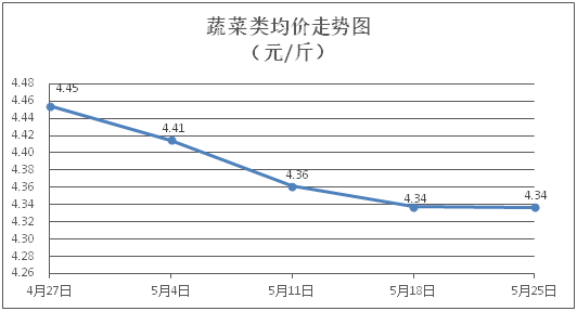 蔬菜类商品价格升降互现。所监测的32 种蔬菜商品价格波动情况为11涨15跌6平,综合零售均价为每斤4.34元,环比下降0.02%。其中:涨幅居前的品种包括丝瓜、芥兰、莴笋,零售均价分别为每斤4.44元、5.27元、3.62元,环比分别上涨3.74%、3.54%、2.26%;跌幅靠前的品种包括本地菜心、苦瓜、椰菜,零售均价分别为每斤4.69元、4.50元、2.75元,环比分别下降3.70%、2.81%、2.14%。