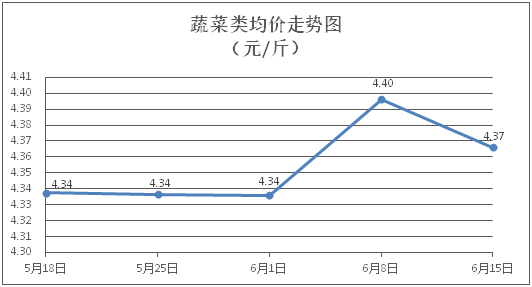 蔬菜类商品价格涨少跌多。所监测的32 种蔬菜商品价格波动情况为11涨21跌,综合零售均价为每斤4.37元,环比下降0.69%。其中:涨幅居前的品种包括菠菜、奶白菜、莲藕,零售均价分别为每斤5.95元、4.88元、5.61元,环比分别上涨7.21%、2.74%、2.56%;跌幅靠前的品种包括青豆角、丝瓜、白苋菜,零售均价分别为每斤4.97元、4.39元、3.92元,环比分别下降6.58%、5.59%、5.54%。