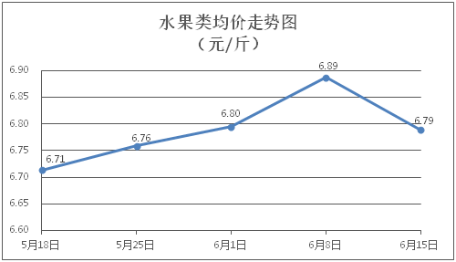 水果类商品价格稳中有降。所监测的6种水果商品价格波动情况为1涨2跌3平,综合零售均价为每斤6.79元,环比下降1.43%。其中橙子、香蕉、葡萄零售均价分别为每斤6.52元、3.44元、14.49元,环比分别下降0.91%、上涨0.29%、下降3.59%。