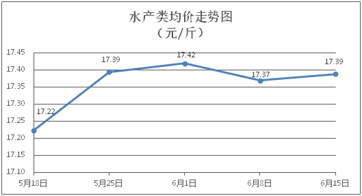 水产类商品价格窄幅波动。所监测的9种水产商品价格波动情况为3涨3跌3平,综合均价为每斤17.39元,环比上涨0.11%。其中:草鱼、鲫鱼、淡水鲈鱼、基围虾零售均价分别为每斤11.18元、14.20元、22.38元、30.59元,环比分别下降0.18%、下降0.63%、上涨0.09%、上涨0.43%。
