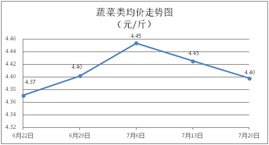 蔬菜类商品价格总体略降。所监测的32 种蔬菜商品价格波动情况为10涨19跌3平,综合零售均价为每斤4.40元,环比下降0.61%。其中:涨幅居前的品种包括青尖椒、西洋菜、蒜苔,零售均价分别为每斤4.43元、4.11元、7.67元,环比分别上涨2.31%、1.48%、1.19%;跌幅靠前的品种包括莲藕、白苋菜、生菜,零售均价分别为每斤5.39元、3.97元、3.89元,环比分别下降3.92%、2.70%、2.51%。
