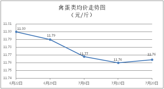 禽蛋类商品价格弱势盘整。所监测的5种禽蛋类商品价格波动情况为1涨3跌1平,综合零售均价为每斤11.76元,环比上涨0.03%。其中:白条鸡、白条鸭零售均价分别为每斤20.66元、15.39元,环比分别上涨0.39%、下降0.19%;鸡蛋、鸭蛋零售均价分别为每斤6.52元、7.11元,环比分别下降0.15%、持平。