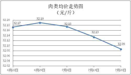 肉类商品价格走势偏弱。所监测的8种肉类商品价格波动情况为2涨5跌1平,综合零售均价为每斤32.09元,环比下降0.15%。其中:排骨、精瘦肉、牛肉、带骨羊肉零售均价分别为每斤30.25元、18.88元、46.51元、42.08元,环比分别上涨0.20%、下降0.11%、下降0.30%、下降0.26%。